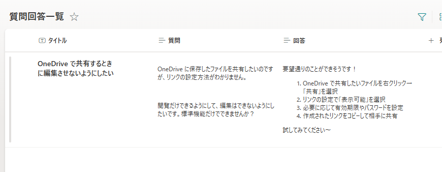 しかし、質問にはいくつかの返信が連なり、あとから確認するときにはどれが回答であるか分かりづらいものです。また、質問と回答が整理されて一覧になっていれば、さらに探しやすくなるかもしれません。