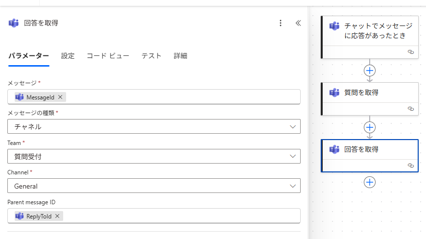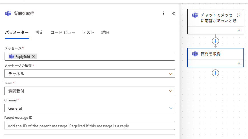 同様に回答となる返信の内容も取得します。「メッセージ詳細を取得する」アクションを追加し、設定していきます。