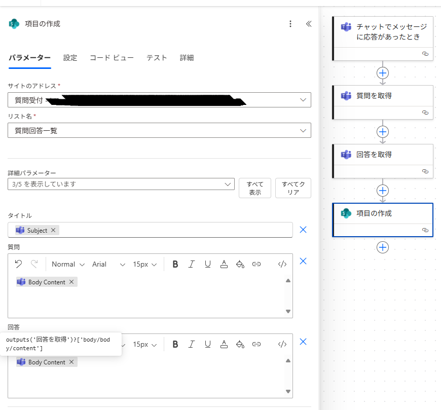| 回答 | 「回答を取得」アクションの「Body Conent」 |