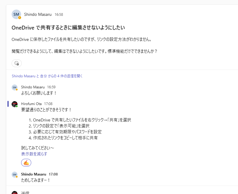 Microsoft Teams を利用して質問を受け付けるチャネルなどを作り、そこで QA のような形でチーム内でナレッジを共有するような仕組みもよく見られます。