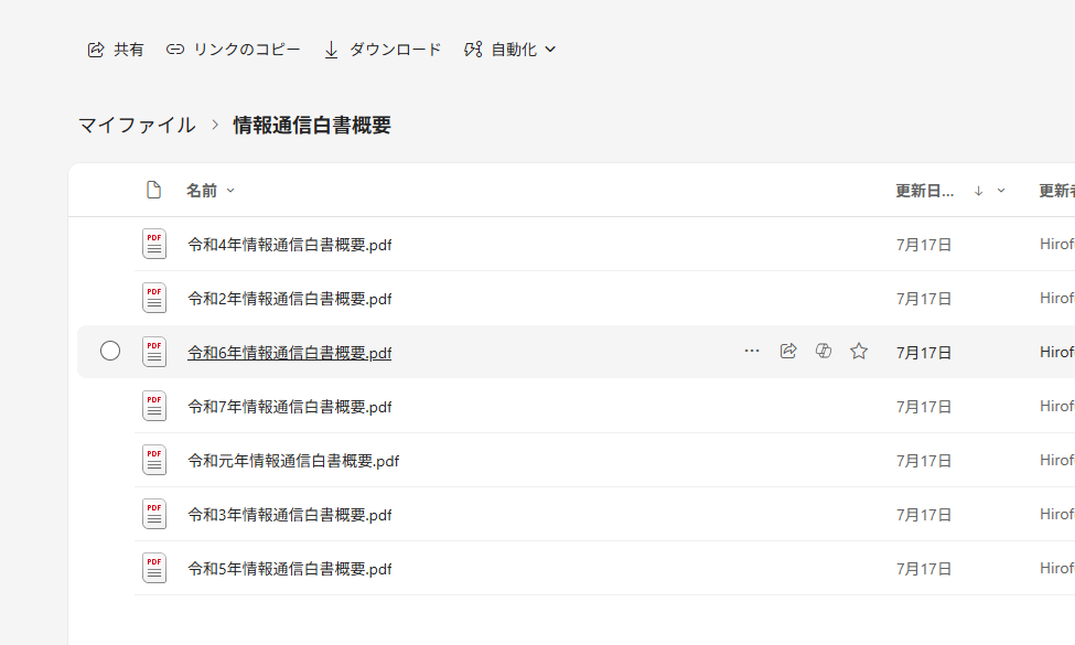 まずは、ひとつのファイルにまとめたい PDF ファイルを、自身の OneDrive にアップロードしておきます。このあたりは普段から OneDrive をエクスプローラーで同期して利用していれば、何もせずとも自動的にアップロードされているはずです。ブラウザで開いて確認してみましょう。