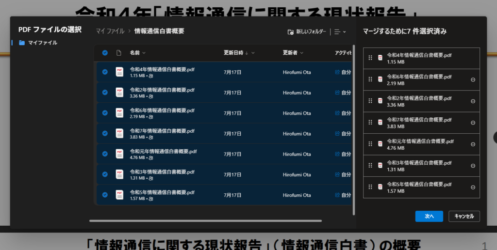 PDF ファイルを結合するためのダイアログが表示されました。ここでまとめたい PDF ファイルをすべて選択します。ファイルをひとつのフォルダーに保存しておくと作業が楽ですね。
