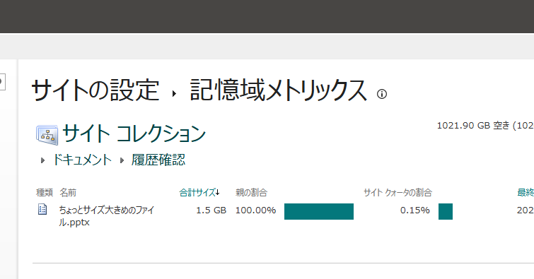 記憶域メトリックスの画面が開くので、[ドキュメント] フォルダーの中にある先ほど編集して複数のバージョンを作成しておいたファイルを開きます。するとどうでしょうか、今回の例では元のファイルのサイズが 377 MB であったのに対し、実際に消費している容量は 1.5 GB となっていました。これはすべてのバージョンのサイズを合計したものと等しくなっています。つまり、ファイルを編集して新しいバージョンが作られるたびに、裏側ではファイルのコピーが作成され保存されていることが分かります。