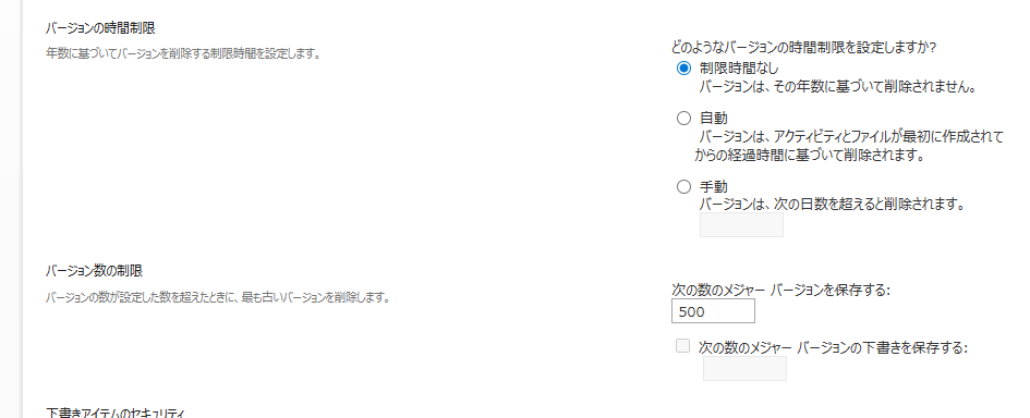 そしてさらに全般設定のなかに [バージョン設定] があるので、こちらをクリックすることで設定を確認できます。既定では、[バージョンの時間制限] が [制限時間なし]。[バージョン数の制限] が「500」に設定されているはずです。