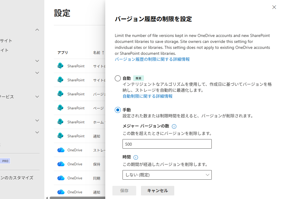 こちらの設定を変更することで、古いバージョン履歴の削除を自動化することができます。