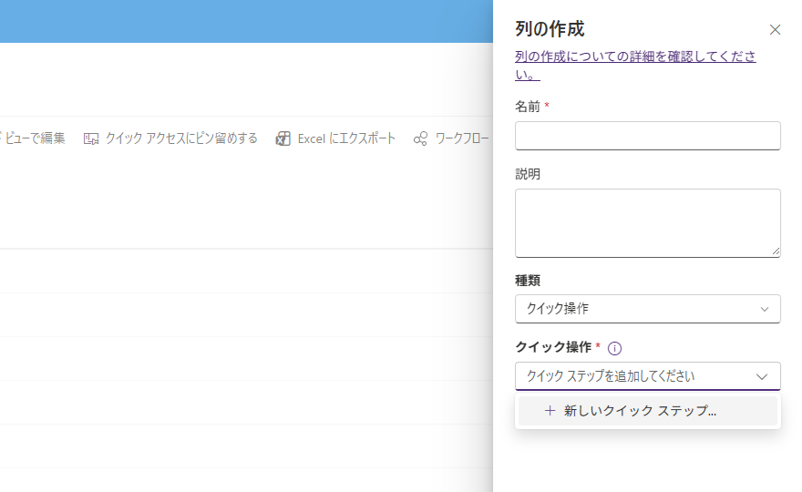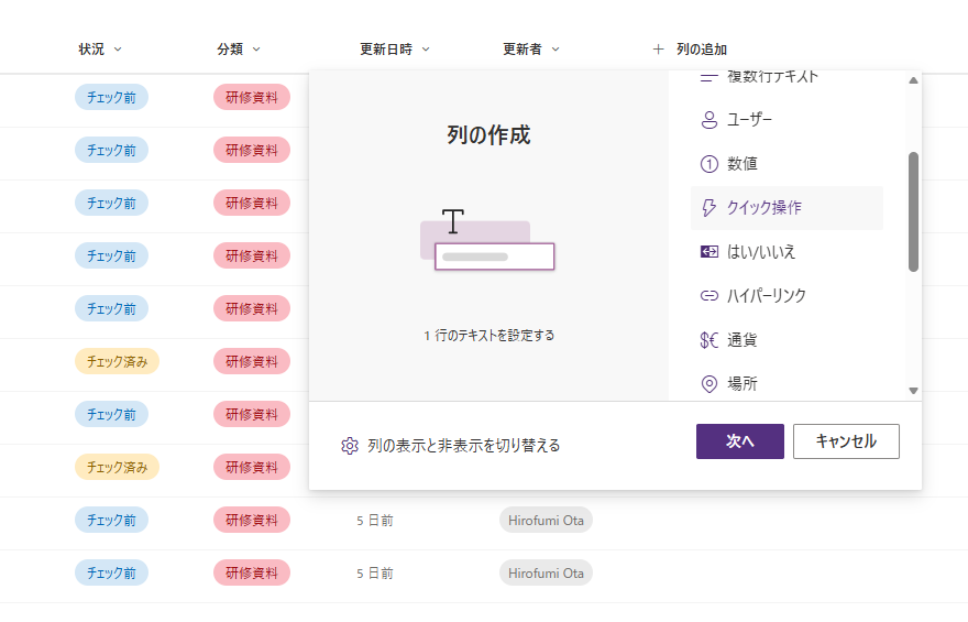 リストやライブラリにクイック操作列を追加