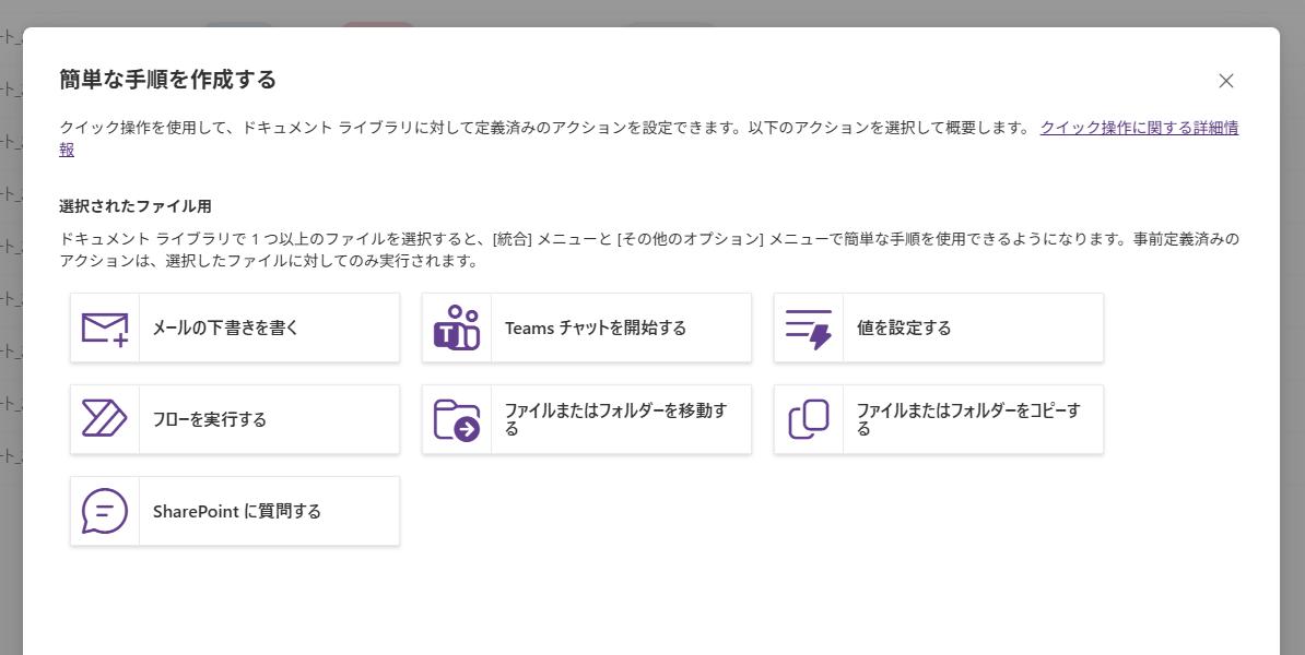SharePoint Onlineのリストやライブラリには、以前のアップデートで「クイック操作」と呼ばれる、あらかじめ登録した処理を簡単に呼び出して実行できる機能がされていました。