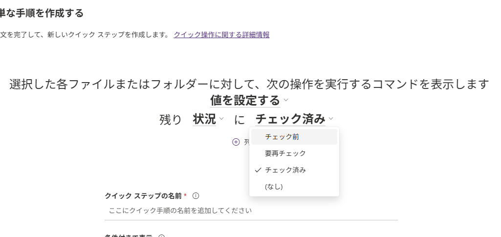 ここでは、あらかじめ決められた項目を穴埋めしていくように設定します。ライブラリに追加している「状況」列の値を、ワンクリックで「チェック済み」に変更する処理にしてみます。