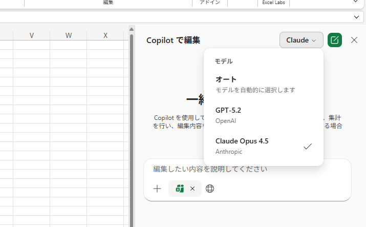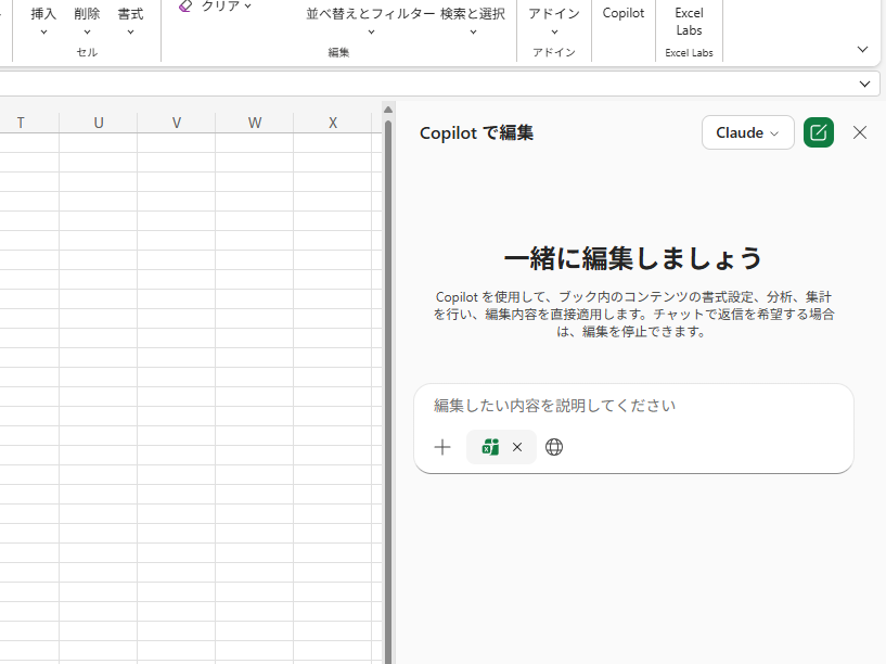 Excel で Copilot を開き、[Copilot で編集] モード(エージェントモード)に切り替わっていることを確認しましょう。