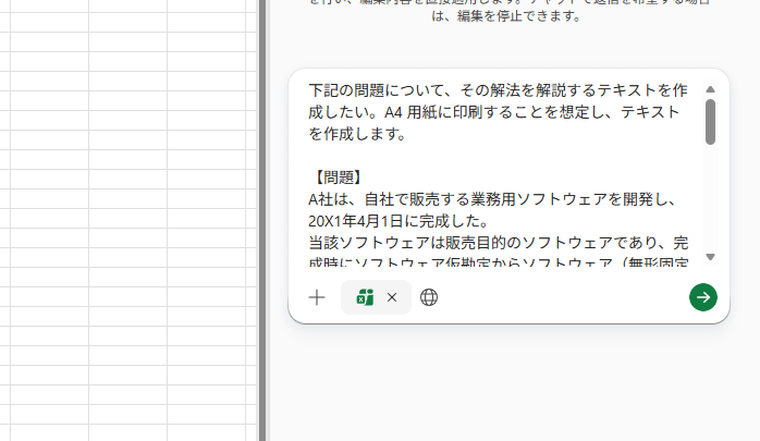 まずは、例題が必要だなと思い、業務にも関係しそうな内容に基づいて、簿記試験っぽい問題を考えてもらうことにしました。これは通常の Copilot チャットで行います。