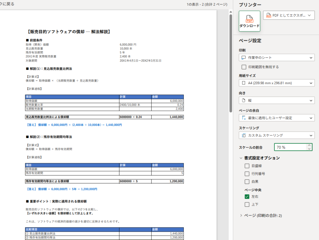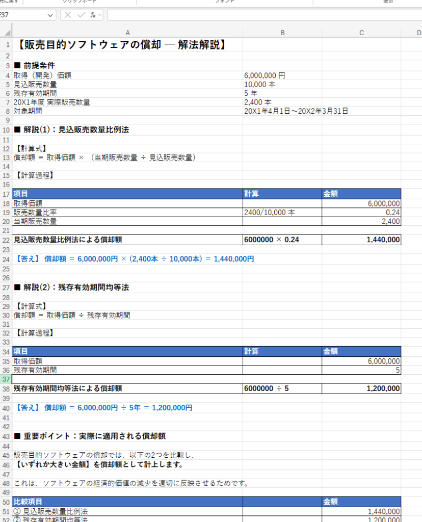 今回は、開発したソフトウェア資産の償却方法として、見込販売数量に基づくものと残存有効期間に基づくものがあるというなんとなくの知識から、これの理解を深めるための例題を作成してもらいました。